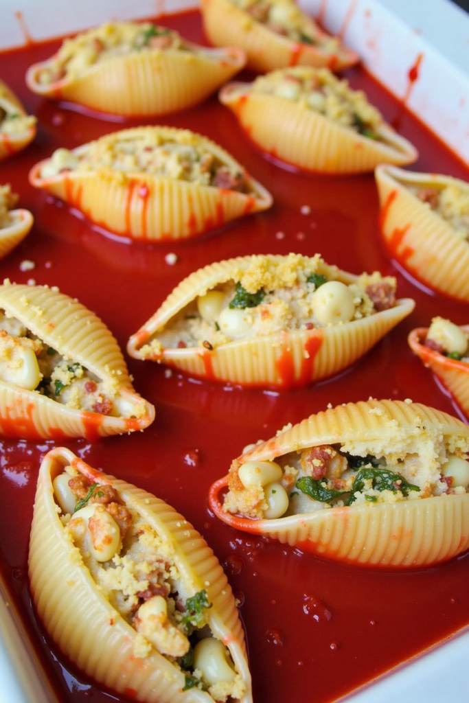 Lay a bed of zesty marinara sauce in your baking dish and nestle the filled pasta shells inside, open side up for maximum visual impact. Smother with more sauce and mozzarella. Bake until bubbly, then drizzle additional sauce on top to amp up the “bloody” appearance right before serving. Add plastic zombie hands or candy eyes for an unforgettable (and Instagram-worthy) presentation.