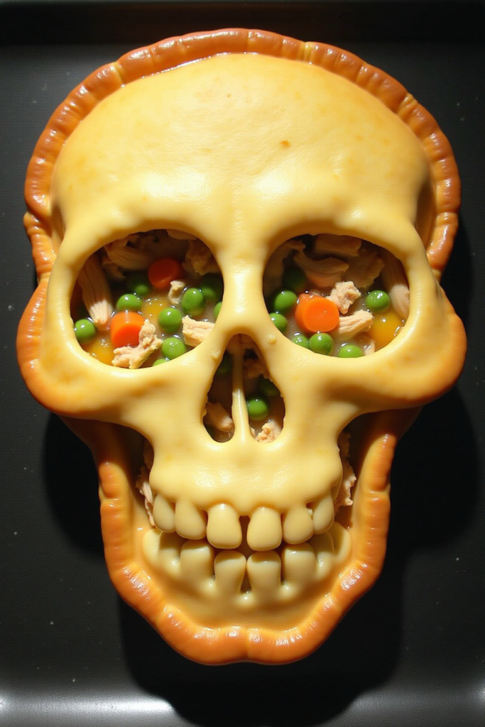 Divide the chicken mixture among individual ramekins or a baking dish, cover with the prepared skull pastry, and press the edges to seal. Before baking, score the pastry to accentuate skull features. Bake until the crust is deeply golden and the filling is bubbly. The result? A deliciously spooky main course that’s as much a feast for the eyes as the palate.